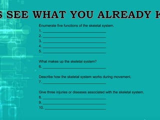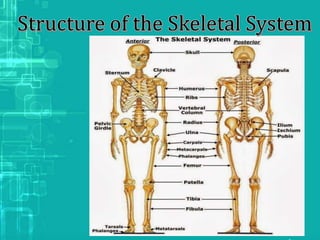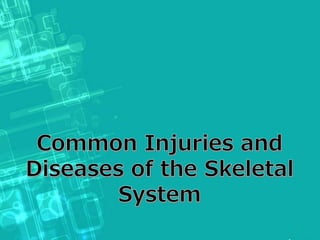 The document provides information about fractures of the skeletal system. It defines closed and open fractures, noting that open fractures have broken skin and are more prone to infection since the bone is exposed. It advises that if there is an open fracture with a protruding bone, one should call for help immediately while controlling bleeding with steady pressure on the wound until assistance arrives. The summary emphasizes the risks of open fractures and the importance of promptly seeking medical care for open fractures.