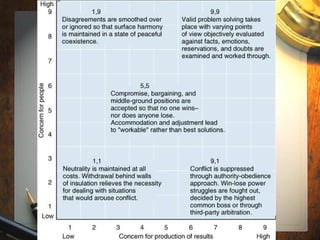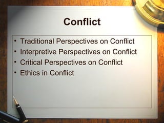 This document provides an overview of traditional perspectives on conflict, including definitions of interpersonal conflict and styles of conflict management. It discusses positives and negatives of conflict, and five styles of conflict management: avoiding, forcing, accommodating, collaborating, and compromising. The document also examines competence-based approaches to conflict, focusing on phases of conflict such as differentiation, mutual problem description, and integration. Additional topics covered include groupthink and how to avoid it, and dimensions of conflict including content, relational, and situational factors. Finally, the document outlines strategies for managing conflict based on interests, rights, and power.