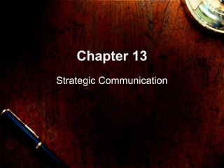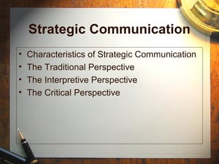 The document discusses three models of strategic communication: linear, adaptive, and interpretive. The linear model views strategy as long-term planning by top managers to achieve goals through rational decision making. The adaptive model focuses on continuously adjusting the organization to its dynamic environment through co-alignment. The interpretive model views strategy as managing meanings and symbols to legitimize the organization through shared understandings. It then covers characteristics like public communication, the communication source, and a transactional approach. Finally, it discusses the traditional perspective on internal communication topics like orientation, morale, and change, and external communication topics like public relations, issues management, and advocacy.