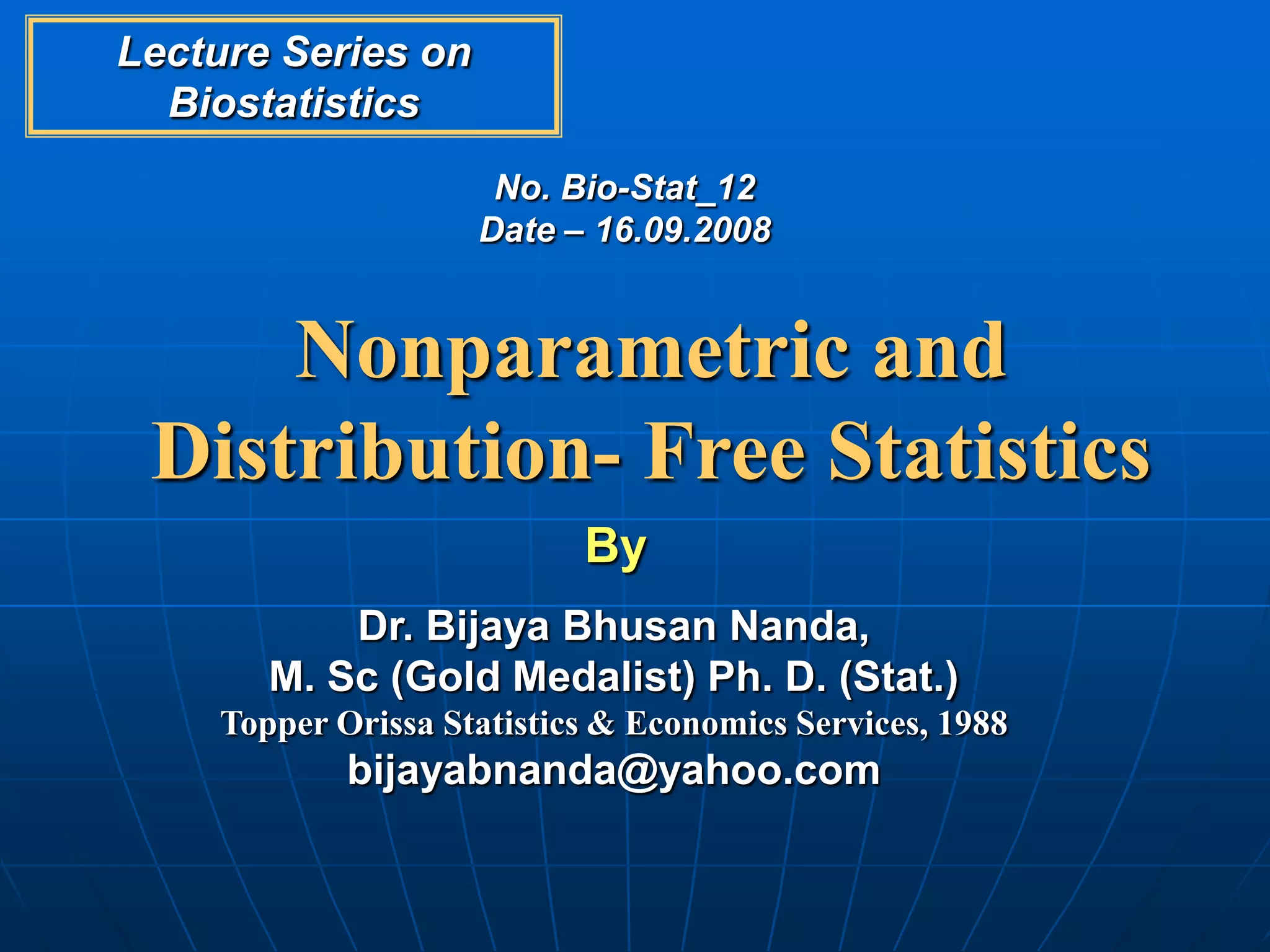 This document summarizes several nonparametric statistical tests that do not rely on assumptions about the population distribution, including the sign test, Wilcoxon signed-rank test, median test, Mann-Whitney test, Kolmogorov-Smirnov goodness-of-fit test, and Kruskal-Wallis one-way analysis of variance. It provides details on the theoretical background, test statistics, assumptions, and procedures for the sign test for single samples and paired data. An example application of the paired sign test to a dental study is shown.