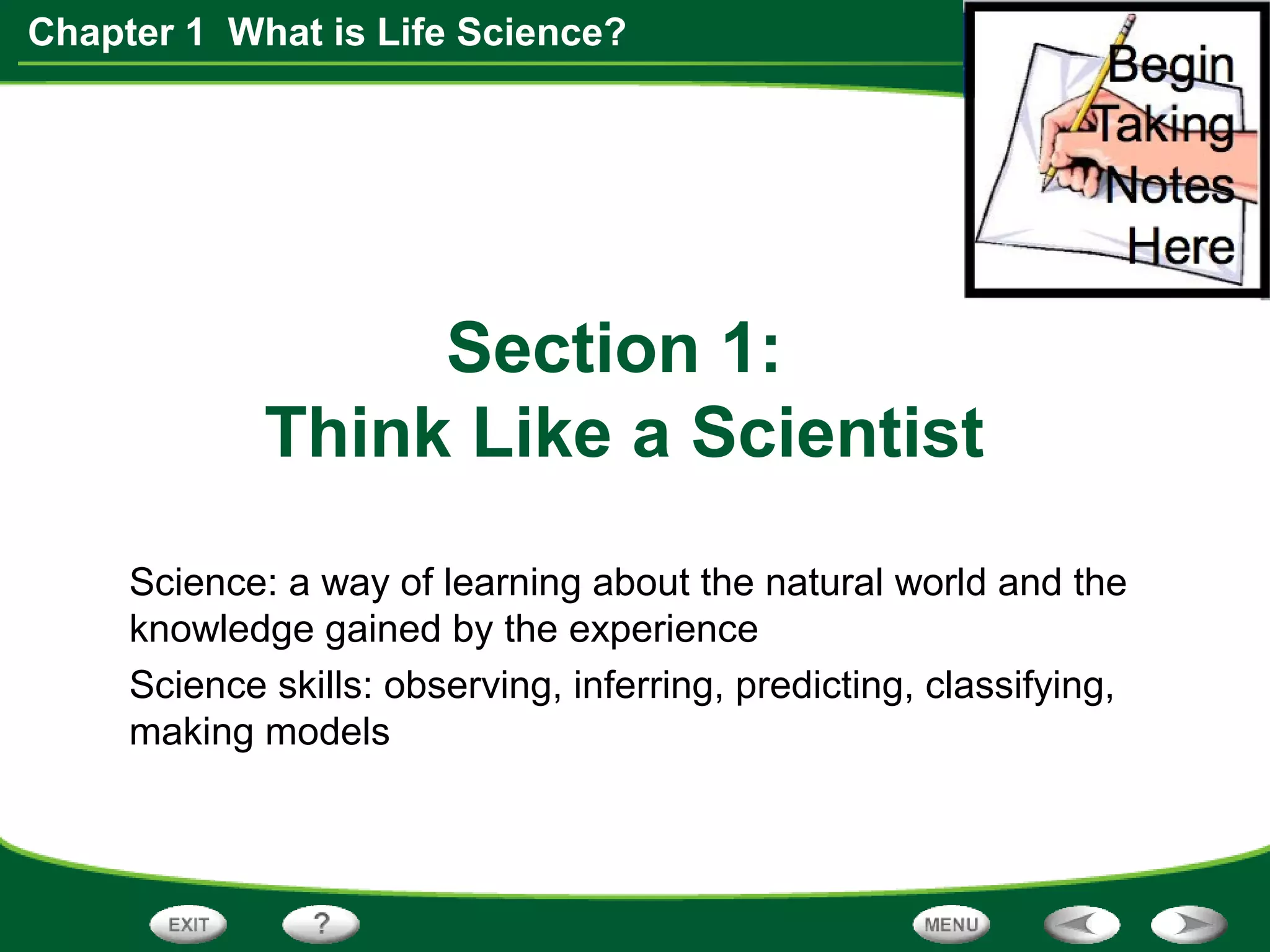 This document discusses the key skills used in life science: observing, inferring, predicting, classifying, and making models. It provides examples of each skill using Jane Goodall's observations of chimpanzees. It also includes a graph about chimp diets and questions to interpret the data, requiring skills like reading graphs, interpreting data, calculating percentages, and predicting based on evidence.