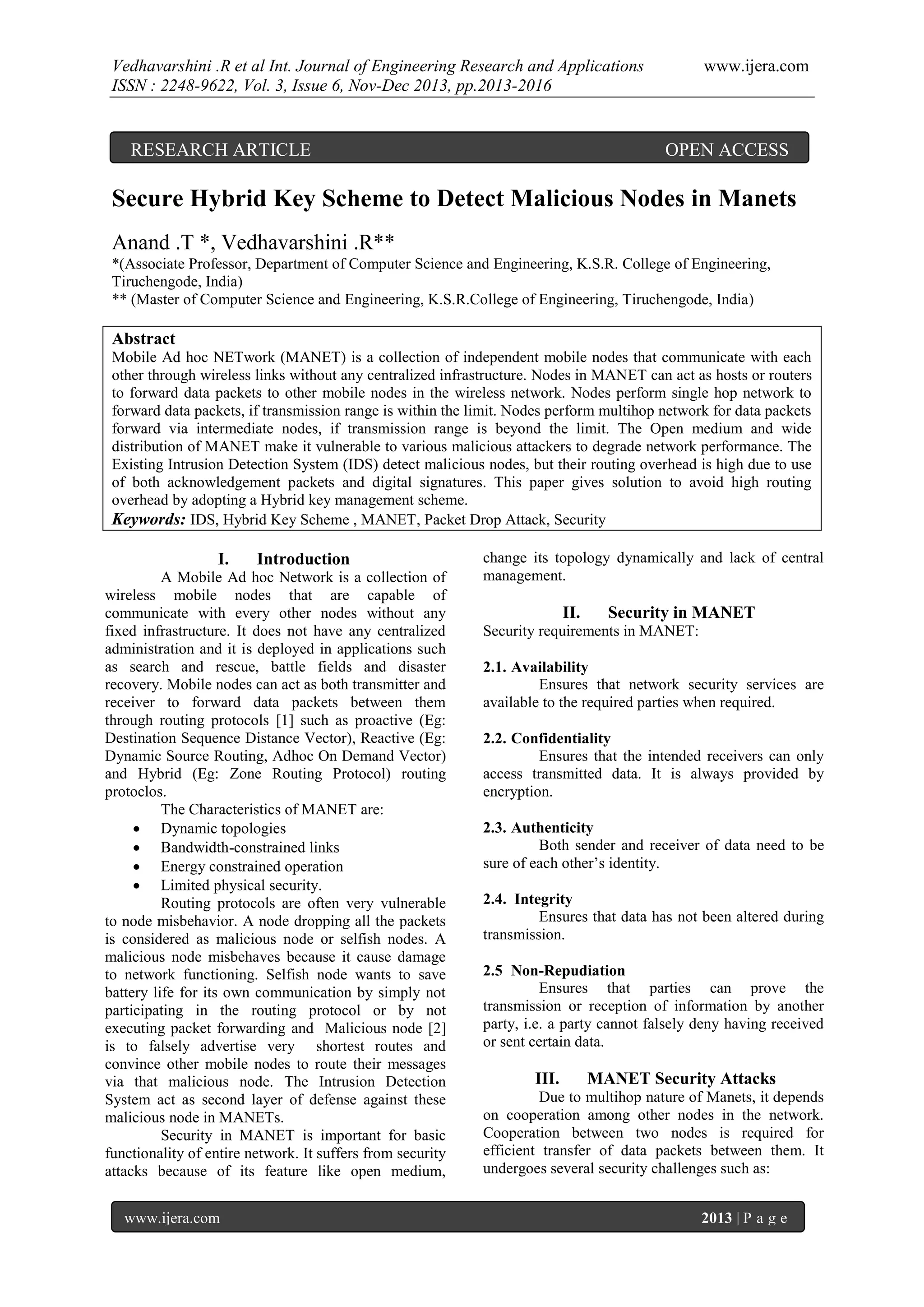 The paper presents a hybrid key management scheme designed to detect and minimize the impact of malicious nodes in Mobile Ad Hoc Networks (MANETs) while reducing routing overhead caused by existing intrusion detection systems. It emphasizes the vulnerabilities of MANETs to both internal and external attacks and discusses various acknowledgment schemes that contribute to packet drop issues. By adopting a combination of asymmetric and symmetric encryption, the proposed method aims to enhance security and improve the overall performance of the network.