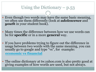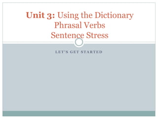 The document provides information about using dictionaries, phrasal verbs, and sentence stress. It discusses using online dictionaries like Google and Yahoo to understand differences between similar words. It gives examples of comparing words like "economic vs financial" and "ceremony vs rite". It also covers transitive and intransitive phrasal verbs, providing examples. Finally, it demonstrates how changing stress in a sentence can change the meaning, like in the example "I don't think he should get that job."