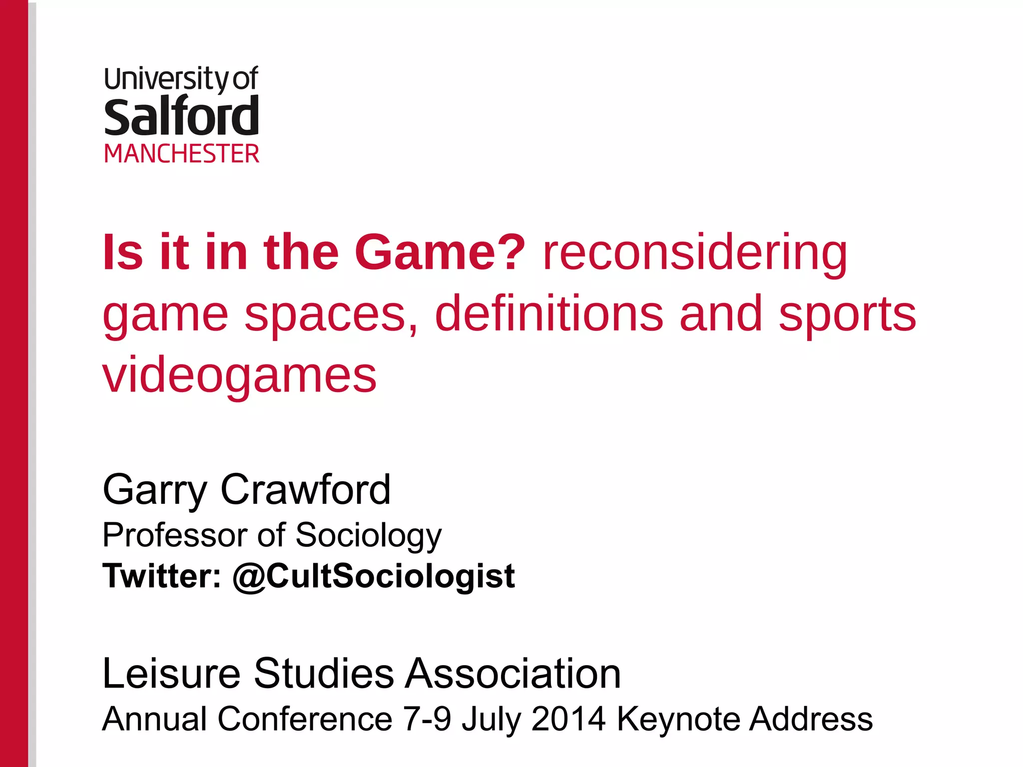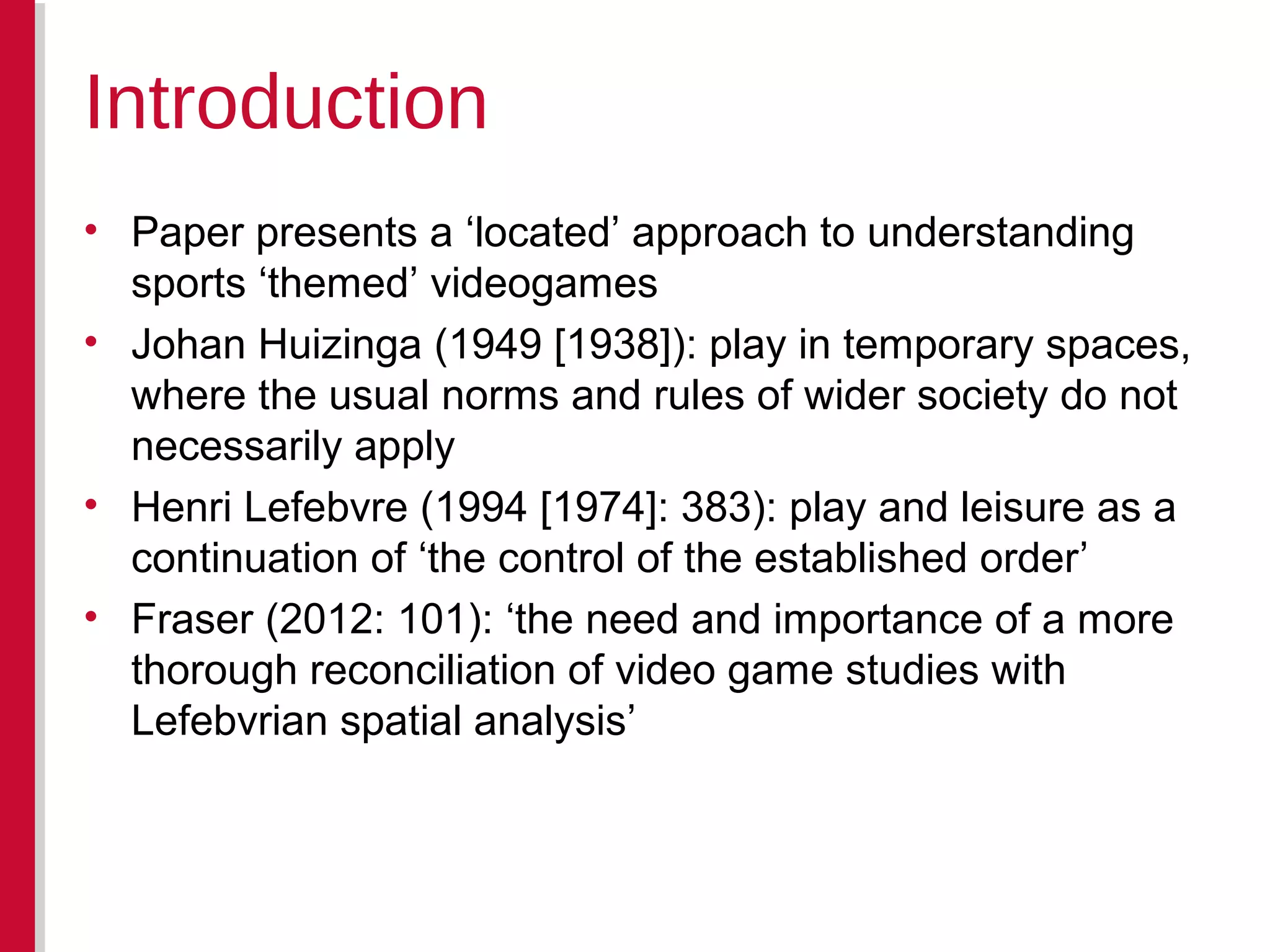 This document discusses defining and understanding sports videogames. It begins by outlining an approach to studying sports videogames that considers them as located within wider social contexts, drawing on theories of play spaces. It then discusses how sports videogames employ theming of real sports venues and events. Finally, it argues that rather than focusing only on what is contained within the game, an analysis of sports videogames should consider what wider context the game is situated within.