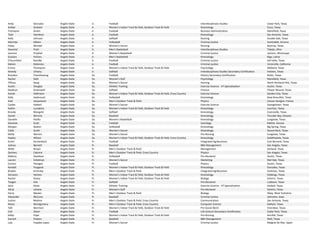 This document lists student athletes at Angelo State University including their year, major, sports they play, GPA and hometown. It includes 81 student athletes ranging from freshmen to seniors playing 18 different sports. Their majors include subjects like kinesiology, education, business, nursing and more.