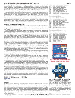 The document provides an update on basketball in the Lone Star Conference. Cameron University leads the men's standings with a 6-2 record, while West Texas A&M leads the women at 8-1. Several players are highlighted for their performances, including Deondre Ray of Cameron who was named Men's Offensive Player of the Week after leading his team to an upset win over Midwestern State. The schedules for upcoming LSC basketball games this week are also listed.
