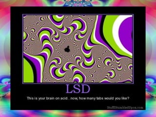 LSD is a hallucinogenic drug developed in 1938 that distorts the user's sense of time and identity. It was used in the 1940s to treat mental illnesses but causes unpredictable effects like delusions, hallucinations, panic attacks and impaired judgment. LSD is typically sold as liquid on blotter paper, gelatin squares or sugar cubes with a dose of 25 micrograms, though only 1% reaches the brain. Effects can last 8-12 hours and include altered visual perception, emotions and thought patterns.