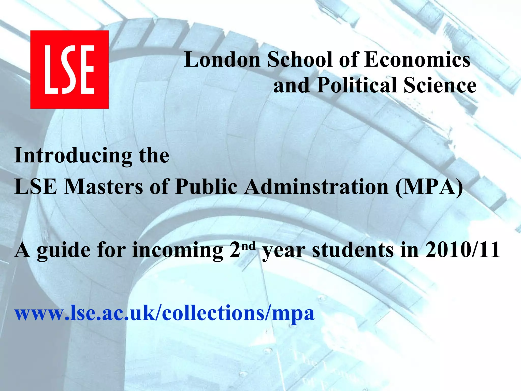 The document provides information about the London School of Economics and Political Science (LSE) Masters of Public Administration (MPA) program. It details the various MPA streams offered, first and second year curriculum requirements, faculty, student outcomes, costs, and the dual degree program which allows students to spend their second year at partner schools in New York, Paris, Berlin, and Singapore.
