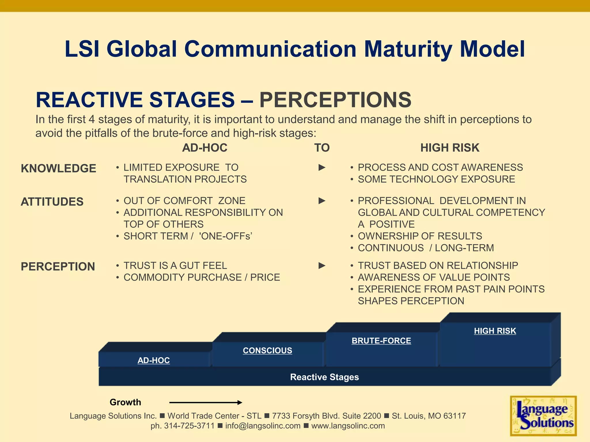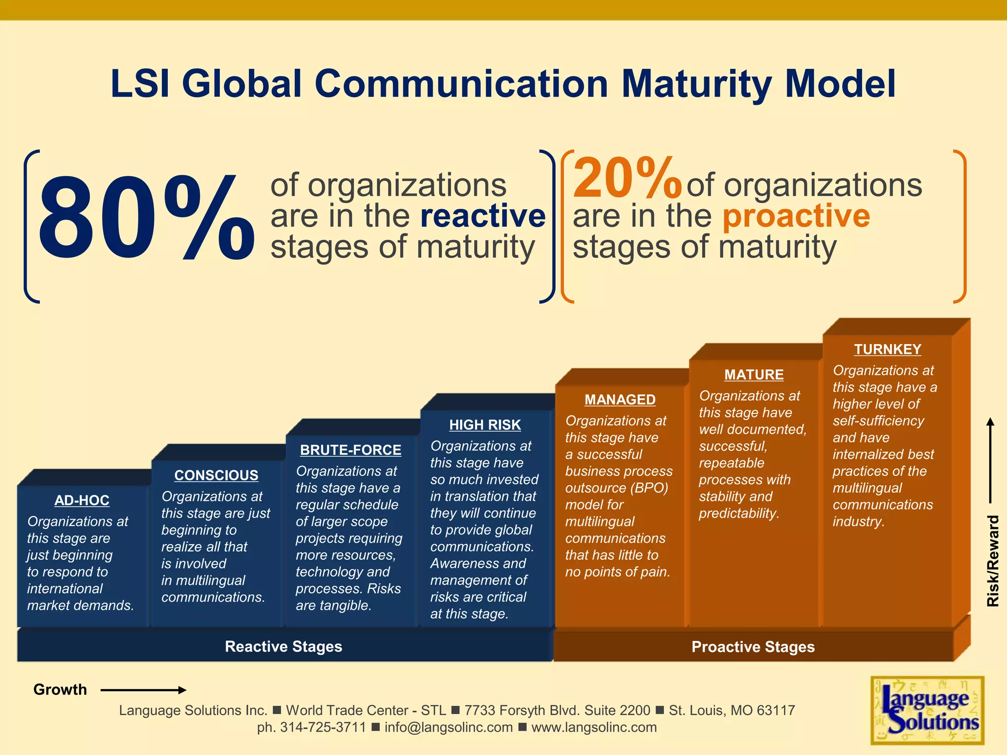 This document describes an 8-stage model of organizational maturity for multilingual communications. It provides descriptions of where organizations are typically at for each stage in terms of scope, organization, process focus, and budget/costs. The stages progress from reactive to proactive. The first 4 stages (Ad-Hoc, Conscious, Brute-Force, High Risk) involve perceptions of translation as a commodity versus strategic value. The last 3 stages (Managed, Mature, Turnkey) involve more standardized, optimized processes and seeing translation as an investment versus cost. The document provides risks and recommendations for how to help organizations at each stage improve and progress to the next level of maturity.