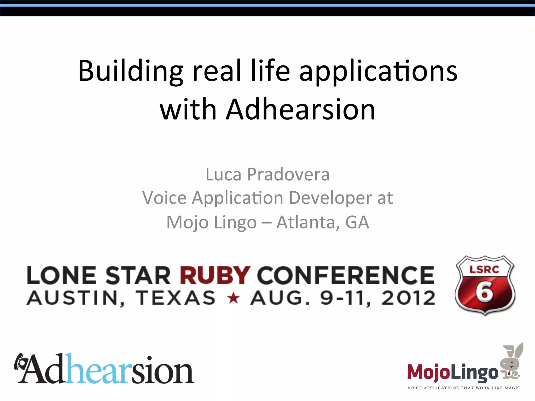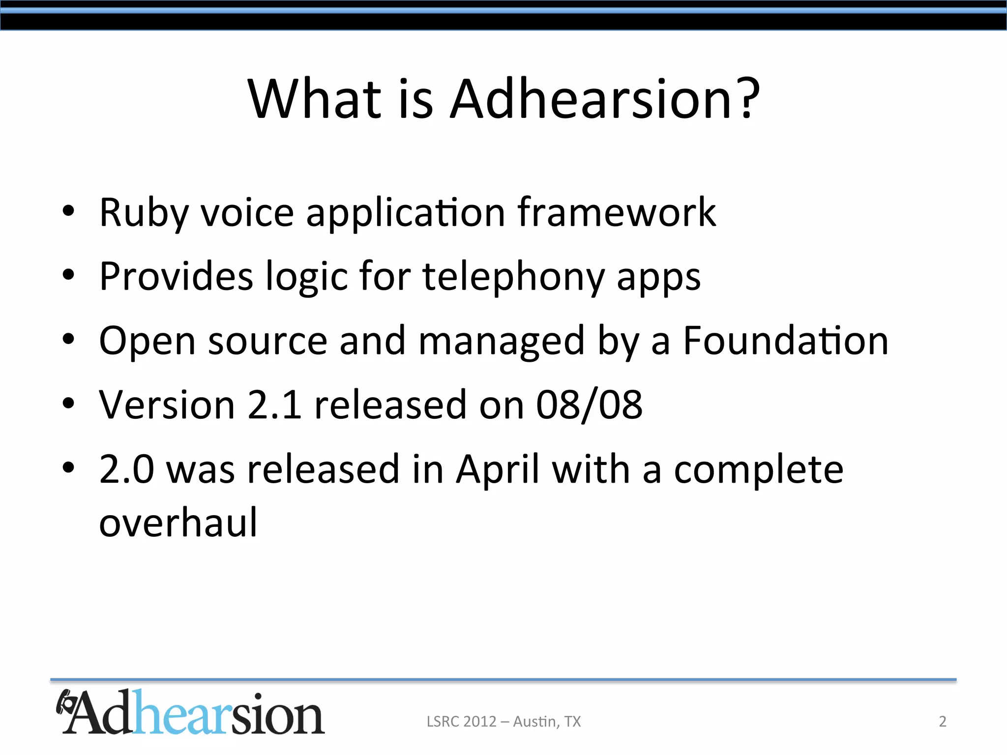 The document discusses Adhearsion, a Ruby-based voice application framework used for telephony apps, highlighting its features, configuration, and support for various platforms. It includes examples of call controllers, routing, and plugins, as well as case studies showcasing its real-life applications in services like translation and mobile operator systems. Adhearsion emphasizes testability, integration, and developer experience, enabling complex interactions and functionalities within communication applications.
