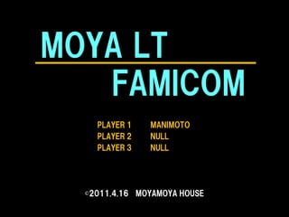 FAMICOM PLAYER 1 MANIMOTO PLAYER 2 NULL PLAYER 3 NULL ©2011.4.16 MOYAMOYA HOUSE