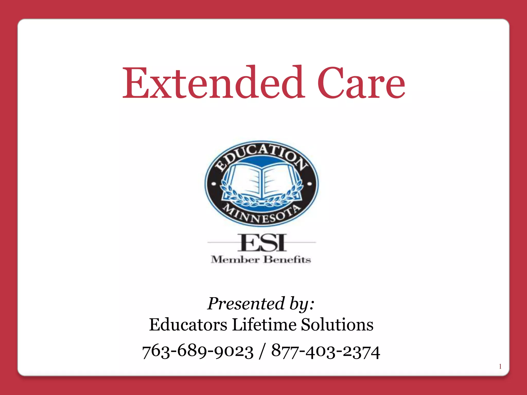 The document discusses the need to plan for extended care as people are living longer lives and may require assistance with daily activities or suffer from cognitive impairments. It notes that over 12 million Americans currently require some form of extended care, with costs averaging tens of thousands per year. The document promotes purchasing long term care insurance now at a younger age to protect assets and have more options for care settings if extended care is needed.