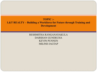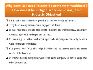 L&T Realty provides training and development programs to build a competent workforce and achieve strategic objectives. They have various programs like the Young Engineers Development Program, Executive Coaching Initiatives, and the Gen Y Abhyuday Program. The Young Engineers Program is a 4-month program with personality development and problem-solving training to develop engineers into leaders. It includes projects, online learning, and presentations to senior management. Leadership development focuses on managing emotional, intellectual, and spiritual qualities. Assigning projects outside participants' roles helps with overall development and competitive advantage. Training supports business goals by improving performance, productivity, and profitability.