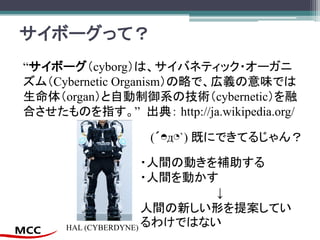 http://ja.wikipedia.org/ HAL (CYBERDYNE) (´◓д◔`) 既にできてるじゃん? ・人間の動きを補助する ・人間を動かす ↓ 人間の新しい形を提案してい るわけではない