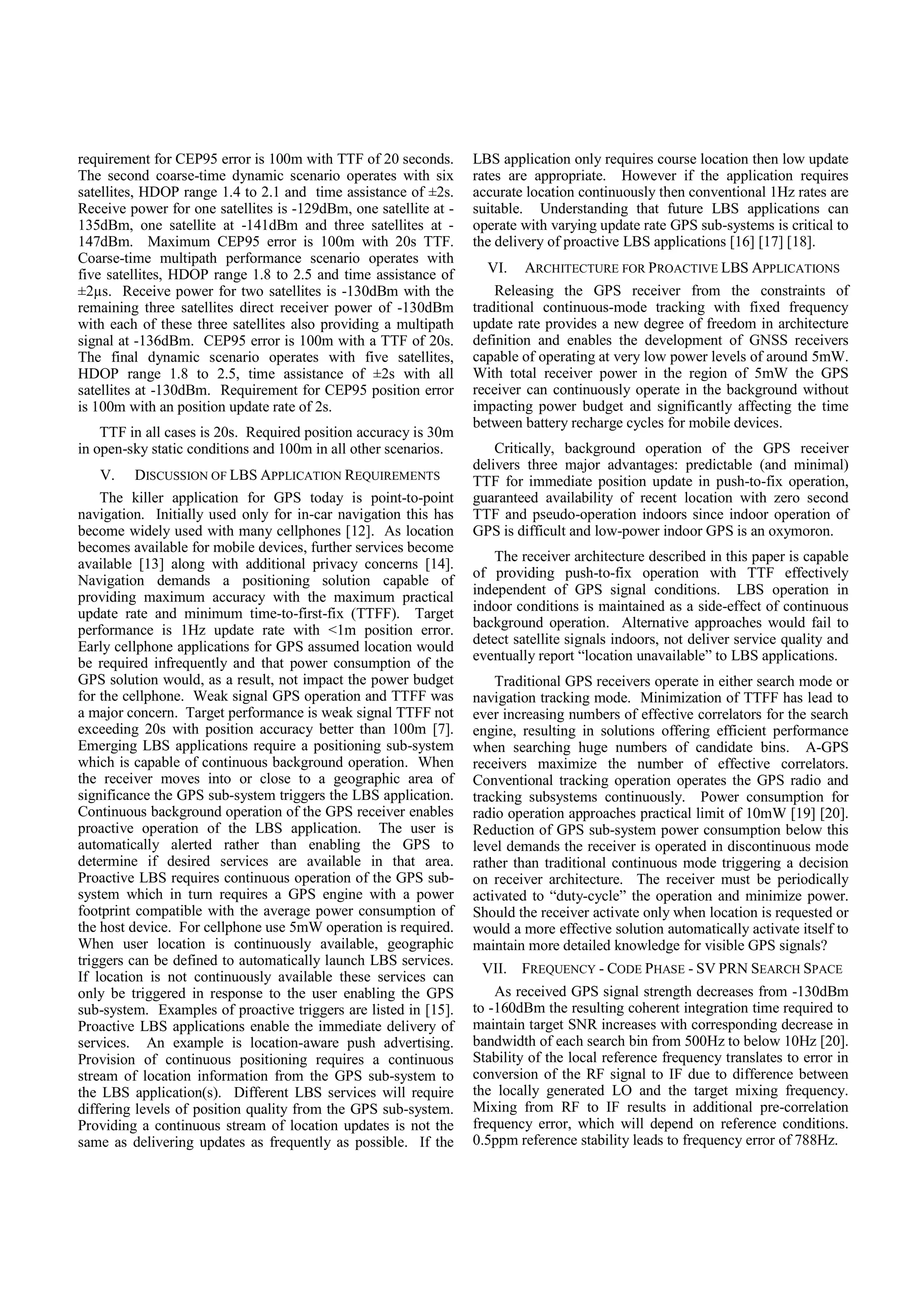 This document summarizes the key aspects of a self-assisting GPS receiver architecture capable of continuous location awareness. Section III outlines GPS system performance, while Section IV covers A-GPS network assistance. Section VI proposes a 5mW receiver architecture that can continuously operate in the background. Rather than optimizing for fast TTFF, it prioritizes maintaining an accurate local GPS time estimate to minimize the search space and deliver push-to-fix operation with sub-2 second TTF even at -150dBm signal levels, outperforming A-GPS. The receiver achieves this through a virtuous cycle of periodically activating to re-lock to GPS and refine its time prediction.