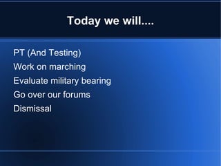 The document outlines a physical training (PT) session taking place on September 25th in Mrs. Walsingham's room. It details that the session will include marching, evaluating military bearing, and going over forums. It also provides information on what PT entails, such as mile runs, sit ups, push ups and shuttle runs. Finally, it lists the PT testing requirements for each age group.
