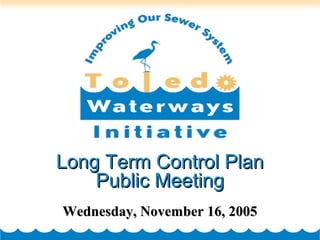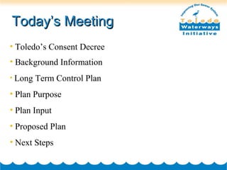 The document summarizes the City of Toledo's Long Term Control Plan to address requirements in its Consent Decree with the EPA and OEPA to improve wastewater treatment and control combined sewer overflows. The recommended plan includes 26 projects to reduce overflows from 32 to 23 locations, decrease discharge frequency from 33 to 4 times per year, and cut discharge volumes and pollutant levels by over 80%. It will cost over $250 million and includes storage basins, tunnels, sewer separation, and other controls to be implemented between 2006-2016. Public input helped develop the plan, which must still be approved by the EPA.