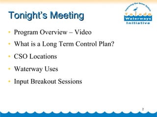 The document summarizes a public meeting to gather input on developing a Long Term Control Plan for managing combined sewer overflows in Toledo. It provides an overview of the city's sewer system, previously constructed CSO control projects, and regulations. It outlines the required contents of the LTCP and alternatives being considered, including storage/treatment facilities, sewer separation, and flow reduction. Meeting participants were asked to provide input on priorities, goals, and preferred alternatives to help develop the draft plan.