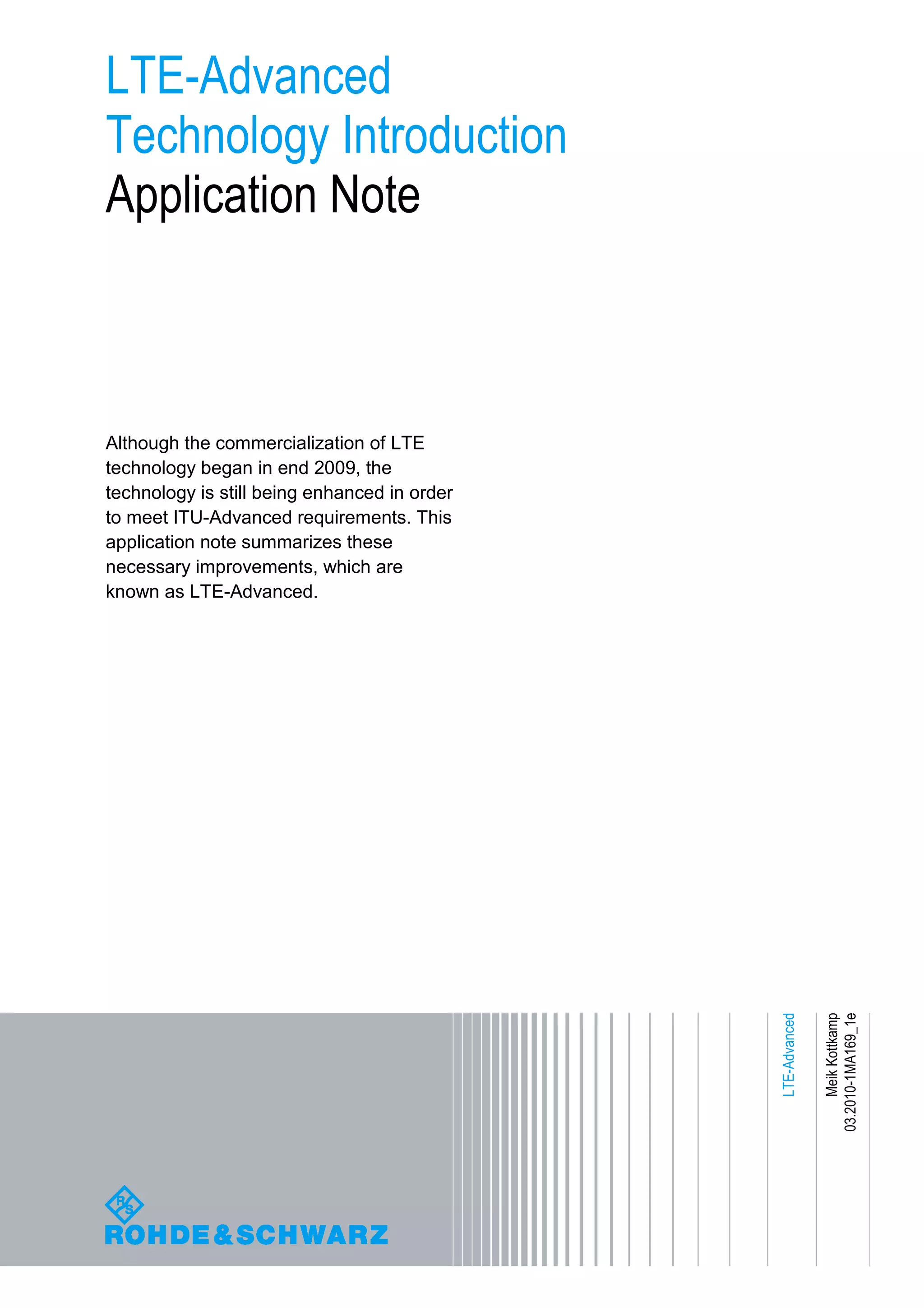 LTE-Advanced improves upon LTE technology to meet the requirements for ITU's IMT-Advanced specification. This document summarizes the key technology components of LTE-Advanced, including band aggregation, enhanced multiple-input multiple-output antenna techniques, improved uplink transmission, coordinated multipoint transmission and reception, and the use of relay stations. LTE-Advanced aims to provide peak data rates of 1 Gbps downstream and 500 Mbps upstream, reduced latency, increased spectrum efficiency, and high throughput for cell edge users.