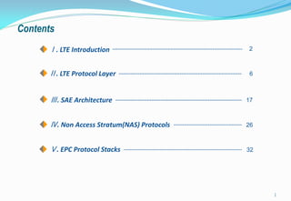 The document provides a comprehensive overview of Long Term Evolution (LTE), detailing its introduction, protocol layers, and System Architecture Evolution (SAE). It highlights the objectives of LTE, including increased data rates and improved spectral efficiency, as well as the core components and functions within the architecture such as the evolved packet core (EPC) and protocols like Non Access Stratum (NAS). Additionally, it outlines various management procedures and elements essential for user equipment connectivity and mobility management within LTE networks.