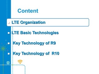 The document discusses LTE key technologies including those from Release 9 and Release 10 of the 3GPP specifications. It describes the organizations involved in developing LTE standards and trials. The basic LTE technologies covered include OFDMA for downlink and SC-FDMA for uplink, frame structure, and peak throughput calculation methods. Key technologies added in Release 9 include enhanced dual-layer beamforming transmission to improve cell capacity and coverage using multiple layers. Release 10 features further expanded the use of multiple antennas and introduced carrier aggregation.