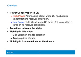 The document discusses power and mobility management in LTE, focusing on the operation of user equipment (UE) in both connected and idle modes. It describes the transitions between these states, how the network manages UE movement through handover, and the structure of tracking areas to optimize signaling. Key concepts include the activity states of the UE, power conservation methods, and the procedures for location updates and paging in idle mode.