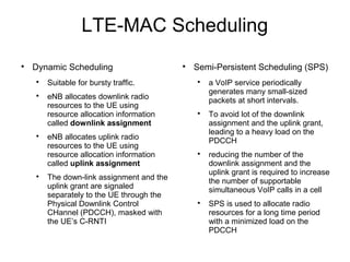 The document discusses LTE medium access control layer concepts. It describes dynamic and semi-persistent scheduling used by the eNB to allocate downlink and uplink radio resources to UEs. Semi-persistent scheduling is used for periodic traffic like VoIP to reduce signaling overhead compared to dynamic scheduling. It also discusses buffer status reporting where UEs indicate how much data they have to transmit, and scheduling requests where UEs request uplink resources from the eNB.