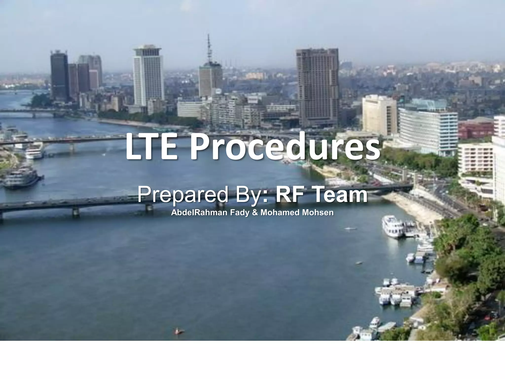 The document summarizes LTE procedures including cell search, cell selection, cell re-selection, tracking area updates, paging, random access channel procedure, mobility handovers between X2 and S1, and handover events. The cell search procedure detects downlink synchronization using two channels, the primary and secondary synchronization channels, which are always located in the center of the available spectrum. The random access channel procedure involves the UE sending preambles, receiving a response indicating resources to use for signaling and data transmission on an uplink channel.