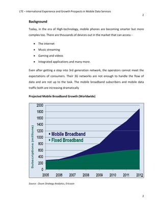 LTE is an emerging mobile network technology that offers faster data speeds and increased network capacity compared to 3G. It is being widely adopted internationally, with over 80 commercial LTE networks expected by the end of 2012. Early country adopters include Sweden, Norway, and South Korea. Mobile operators are investing heavily in LTE networks to handle rapidly growing mobile data traffic and meet consumer demand for bandwidth-intensive applications. LTE is available in different spectrum bands depending on the country and is projected to accelerate the growth of mobile broadband subscribers and data usage worldwide.