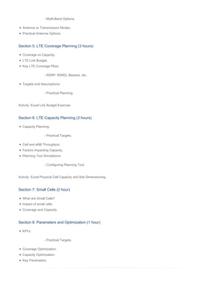 This 2-day course on LTE Radio Network Planning covers the essential steps in the planning process including initial planning, detailed planning, optimization, and key considerations like propagation modeling, antenna selection, coverage and capacity planning, quality of service, and the impact of small cells. The course uses presentations, practical exercises in Excel, and simulations in a planning tool to teach delegates how to effectively plan an LTE radio network.