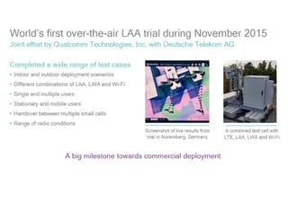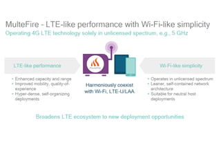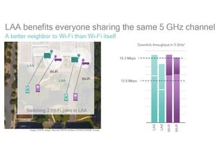 This document discusses LTE-U (Long Term Evolution in Unlicensed spectrum) and how it provides carrier-grade wireless services in the 5GHz unlicensed band. LTE-U aims to offer better performance than WiFi through improved link performance, efficiency, mobility and coverage. It uses mechanisms like Carrier Sensing Adaptive Transmission to fairly share spectrum with WiFi. Licensed Assisted Access (LAA) was later standardized to address different regulations on listening before transmission in different regions. LAA employs Listen Before Talk to ensure fair coexistence with WiFi.
