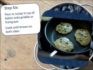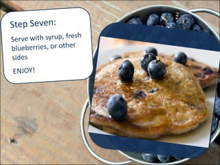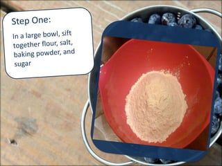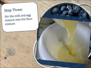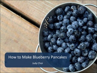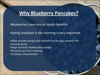 This document provides a recipe and instructions for making blueberry pancakes. It lists the necessary materials, including flour, salt, baking powder, sugar, egg, milk, butter, and blueberries. The instructions outline the steps to mix the dry and wet ingredients separately and then combine them with the blueberries. The document also discusses the health benefits of blueberries, such as boosting brain health and heart health. Additionally, it suggests other uses for blueberries beyond pancakes, such as in jams, vinegars, and skin care treatments.