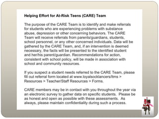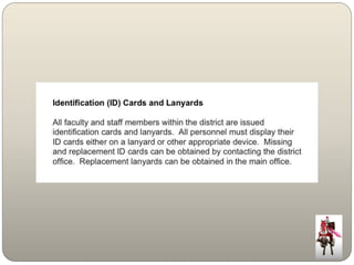 This document provides an agenda and information for a middle school faculty meeting. It introduces the teachers and staff and outlines the schedule for two days of meetings and training sessions. It discusses daily schedules, announcements, supervision of students, character education, communication with parents, and other school policies and procedures.