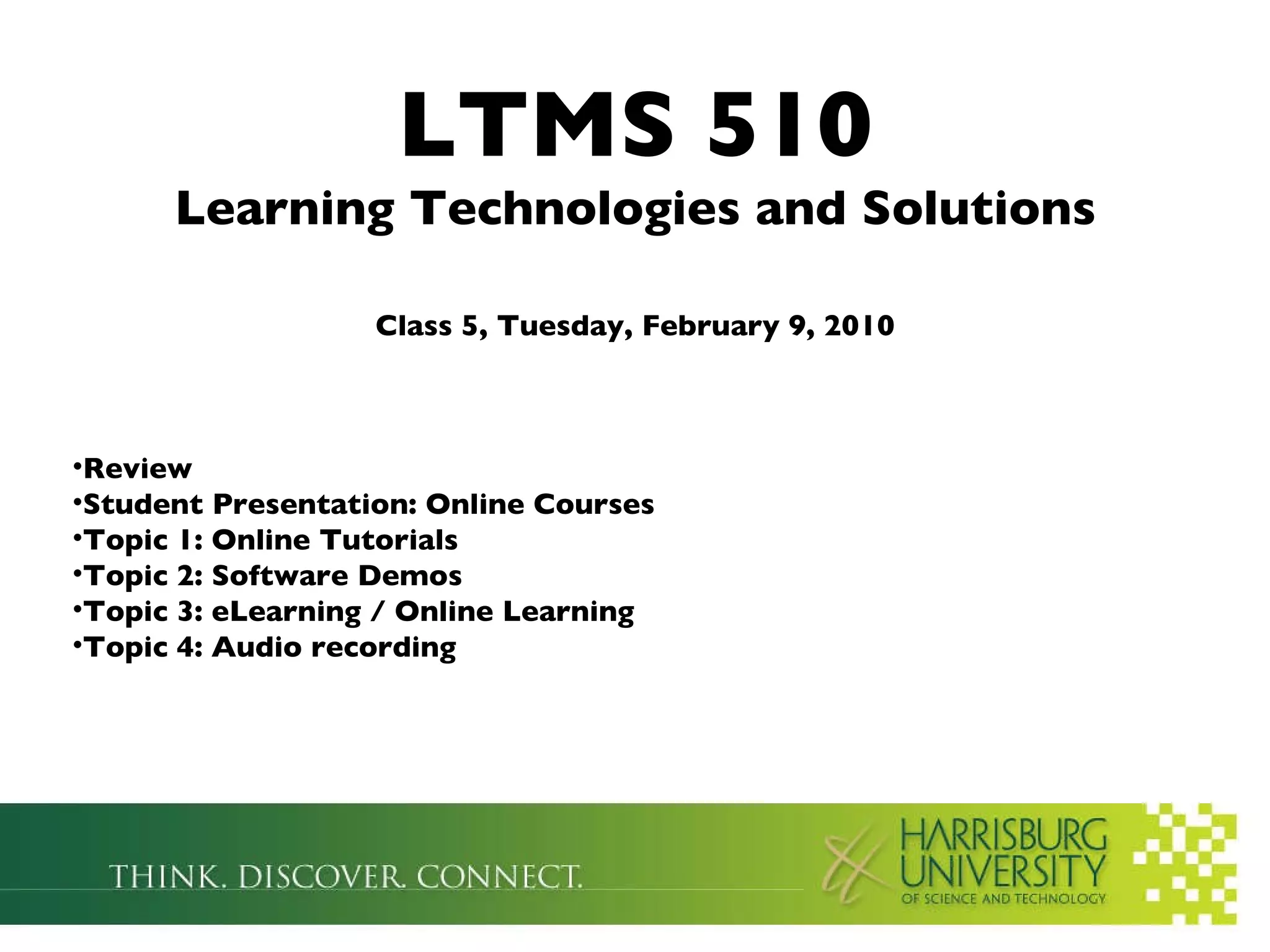 This document summarizes topics discussed in an LTMS 510 class on February 9, 2010, including student presentations on online tutorials, software demos, and eLearning/online learning. It also reviews copyright management systems and discusses eLearning authoring tools, podcasts, and the Learning Technologies Encyclopedia.