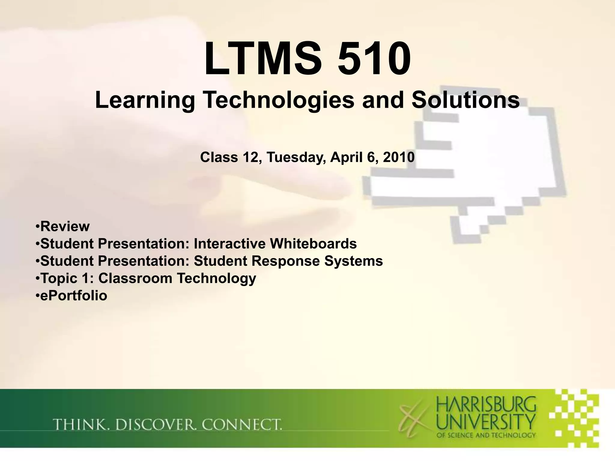 The document outlines a review of various classroom technologies, including interactive whiteboards and student response systems, in the context of a class focused on learning technologies and solutions. It addresses the domains of learning—cognitive, psychomotor, and affective—and discusses technology's impact as a change agent in learning environments. The presentation also includes a range of classroom technology tools and their strengths, weaknesses, and future considerations.
