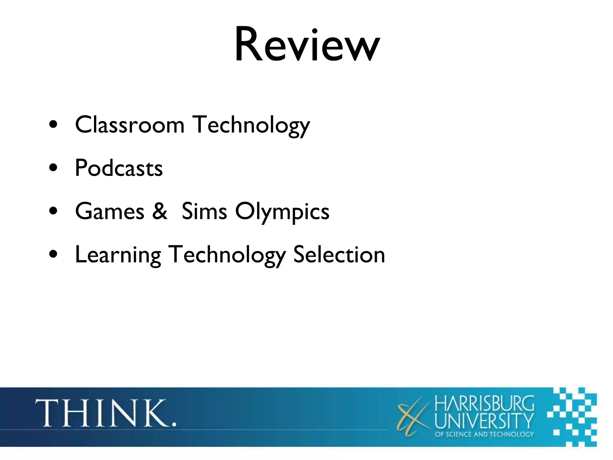 The document outlines a review of student presentations on assessment technology during a class session on April 13, 2010. Key topics include technology-enabled assessment types, various classroom technologies, and considerations for implementing learning solutions. It emphasizes discussions on strengths, weaknesses, and future developments in assessment strategies and learning technologies.