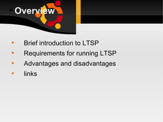 This document summarizes Linux Terminal Server Project (LTSP), which allows thin clients to connect to a Linux server running programs. The server runs services like DHCP, TFTP, NFS, and SSH to allow clients to boot a small Linux image and run graphical sessions remotely. Setting up an LTSP server involves installing Ubuntu or another distro with LTSP support on a powerful server, enabling network booting on clients, and configuring the necessary network services. LTSP provides advantages like centralized management and cost savings over individual workstations but requires a powerful server and fast network.