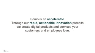 The document outlines Somo's role as an accelerator of innovation, emphasizing the importance of digital products and services in a rapidly changing business environment. It highlights trends such as the growing dominance of mobile devices, changing consumer behaviors, and the need for innovative ownership models. Key strategies for driving innovation include customer feedback, collaborative work environments, and leveraging new technologies like voice assistants and connected devices.