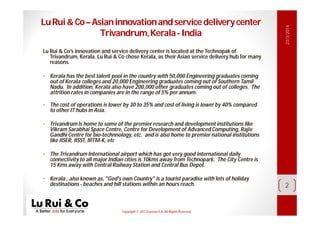 Lu Rui & Co has established its Asian service delivery hub at Technopark in Thiruvananthapuram, Kerala, citing factors such as a strong talent pool and lower operational costs. The center features modern infrastructure and is located near key research institutions and the international airport. The official inauguration of their office took place on January 15, 2014, with significant government presence and a mission to provide excellent service to clients.