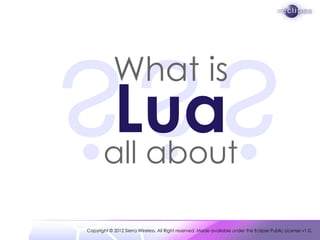 The document discusses Lua, a lightweight scripting language embedded in C/C++ applications. It provides an overview of Lua's uses in games, mobile apps, and embedded systems. The Lua Development Tools (LDT) plugin for Eclipse is presented as a way to provide IDE support for Lua in a manner consistent with its embeddable nature. Future plans for LDT include improved content assistance, support for multiple execution environments, and pre-bundled interpreters.