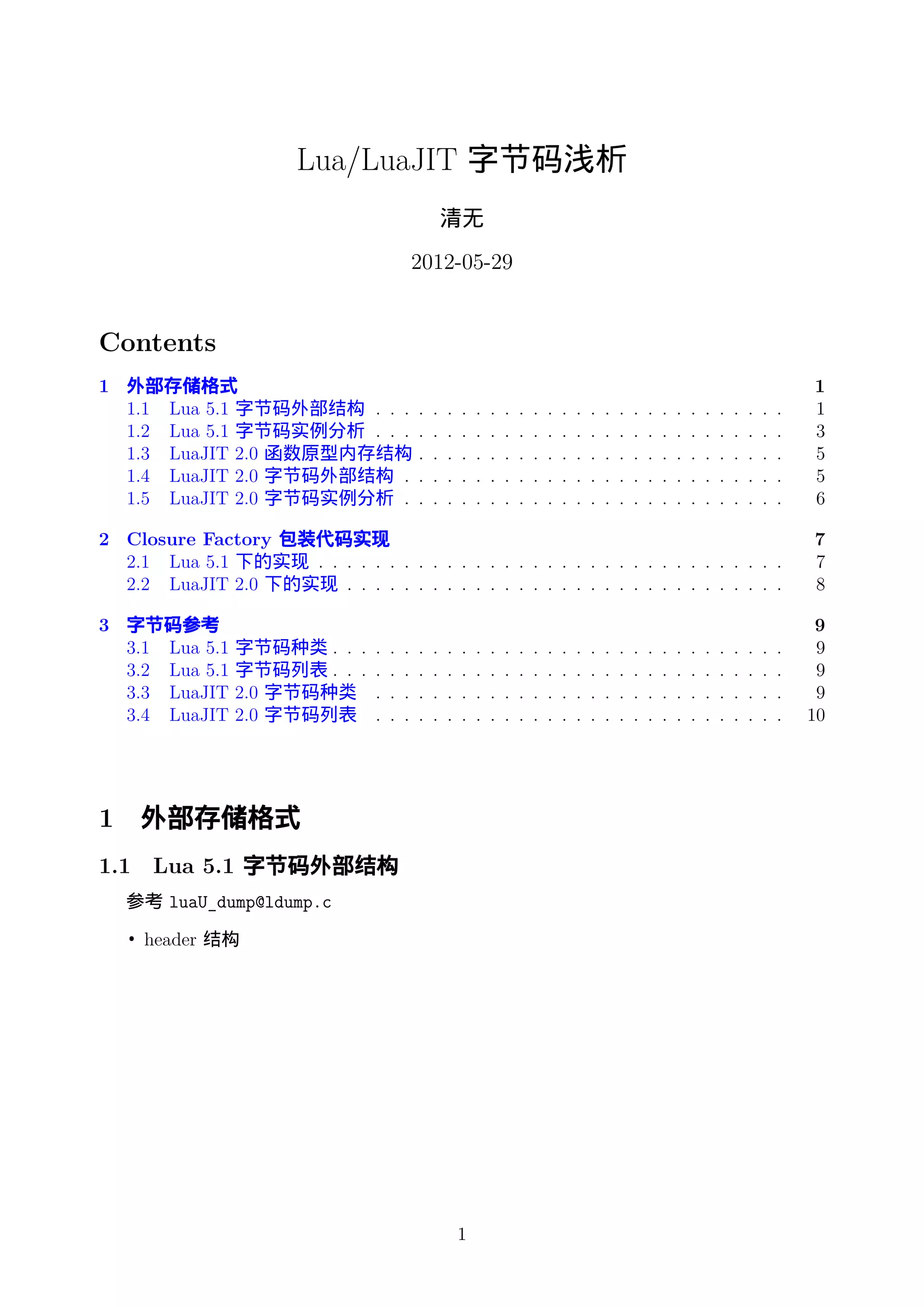 文档对 Lua 和 LuaJIT 字节码格式进行详细分析,包括字节码的外部结构、实例分析以及 closure factory 的实现。它涵盖了 Lua 5.1 和 LuaJIT 2.0 的字节码共享结构及其跨平台能力,并提供了一些具体的字节码示例和参考。最后,文档列出了与字节码有关的所有操作码及其参数类型。