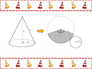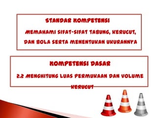 Dokumen ini membahas tentang cara menghitung luas permukaan dan volume kerucut, serta memberikan contoh percobaan untuk memahami konsep tersebut. Selain itu, terdapat latihan soal yang berkaitan dengan penerapan rumus kerucut, seperti menghitung cat yang dibutuhkan untuk mengecat kerucut dan volume gelas untuk menampung es krim berbentuk kerucut. Dokumen ini juga membahas hubungan antara ukuran jari-jari dan tinggi kerucut besar dan kecil.