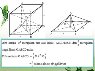 Dokumen ini membahas luas permukaan dan volume limas, dengan tujuan untuk menemukan rumus kedua aspek tersebut dan menerapkannya dalam penyelesaian masalah. Limas didefinisikan sebagai bangun ruang dengan alas berbentuk segi banyak dan sisi tegak berbentuk segitiga, dan dilengkapi dengan contoh perhitungan. Kesimpulannya, luas permukaan limas dapat dihitung sebagai jumlah luas alas dan sisi-sisi tegak.
