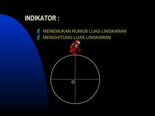 Dokumen ini membahas tentang cara menghitung luas daerah lingkaran menggunakan rumus πr². Disertai dengan contoh perhitungan menggunakan jari-jari yang berbeda, seperti 7 cm dan 10 cm, untuk menjelaskan penerapan rumus tersebut. Penjelasan mencakup cara mengubah lingkaran menjadi persegi panjang untuk menemukan luasnya.