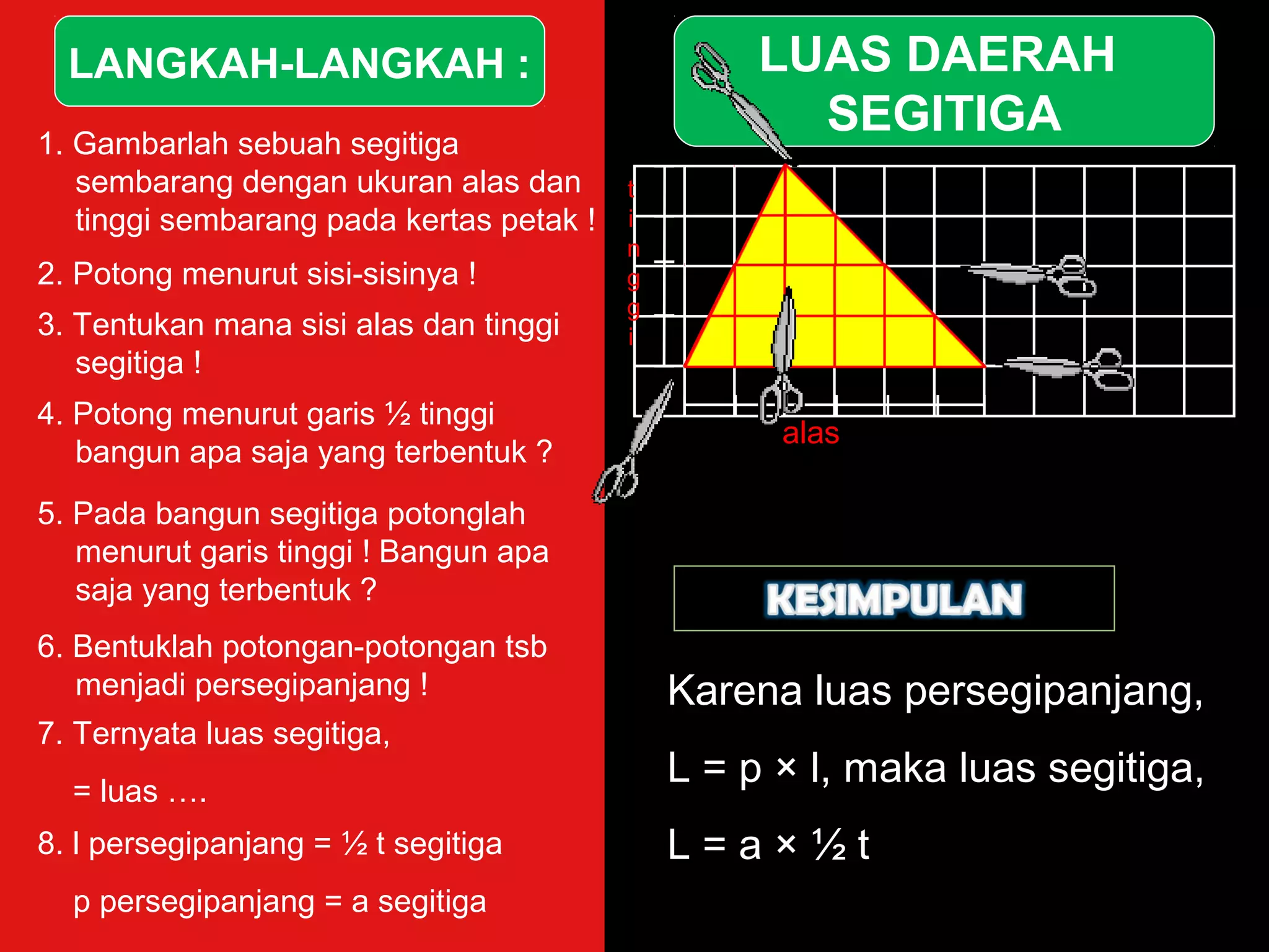 Dokumen memberikan langkah-langkah untuk menghitung luas segitiga dengan memotongnya menjadi persegi panjang dan menggunakan rumus luas persegi panjang. Langkah terakhir menyimpulkan bahwa luas segitiga sama dengan setengah kali alas dikali tinggi.