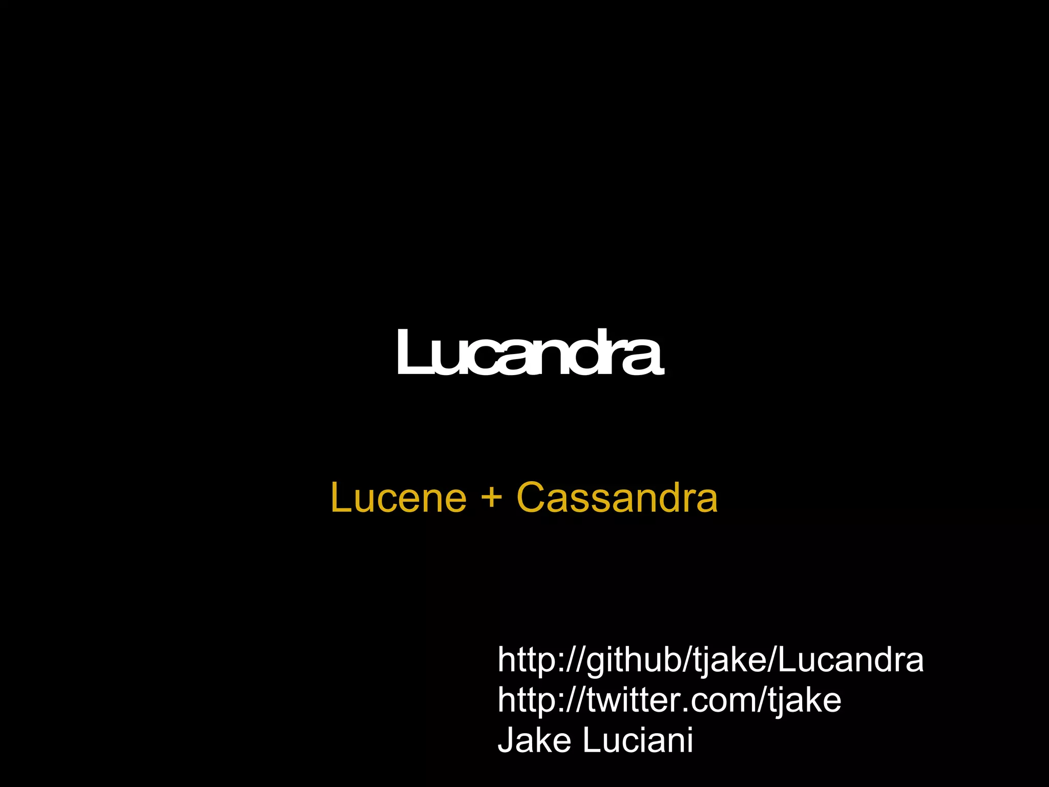 Lucandra is a project that combines Lucene/Solr indexing and search capabilities with Cassandra for storage. It addresses issues with scaling Lucene/Solr by leveraging Cassandra's ability to horizontally scale writes and queries. Lucandra stores Lucene indexes and term vectors in Cassandra to allow distributed indexing and searching across nodes. It has been used successfully in production systems like sparse.ly for twitter search and Wikassandra for Wikipedia search.