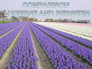Lucerne, also known as alfalfa, is a perennial legume crop that is known as the "Queen of forage crops" as it is highly nutritious, productive, and tolerant of drought and frost. It is cultivated primarily for hay and can be grown in various climates, with optimal growth occurring in loamy soils with adequate drainage. Lucerne fixes atmospheric nitrogen, is highly palatable and digestible for livestock, and can yield between 35-40 tons per acre in Punjab when harvested up to 6 times per year.