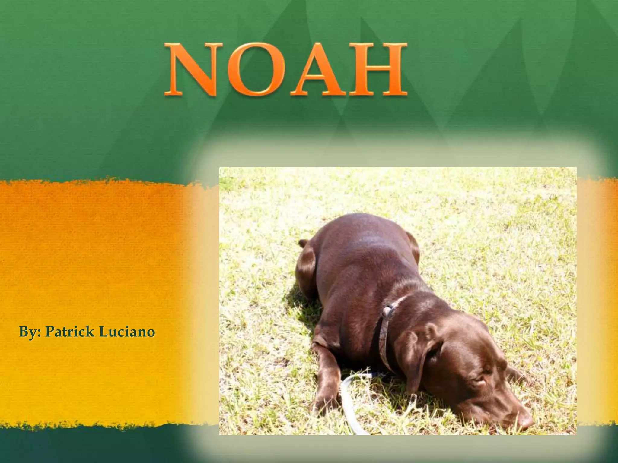 Noah is a Labrador Retriever puppy that enjoys being trained with treats. He has been trained to sit, lay down, stay, and shake paws. Noah's favorite toy is a squeaky toy called a Wubba, which he loves to prance around with daily despite its loud noise. The document includes photos showing Noah snatching up his toy and shaking off seaweed while playing at the beach. Noah also enjoys riding in trucks, playing in water, and accompanying his owner to the golf course.