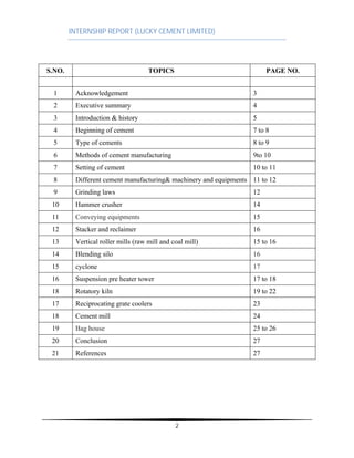 This document is an internship report by Syed Asim Ali Shah, detailing a 12-day internship at Lucky Cement Limited, covering the company's history, structure, and cement manufacturing processes. Key topics include types of cement, manufacturing methods, machinery used, and operations within the production department. The report includes acknowledgments, an executive summary of the internship experience, and various sections focusing on cement's chemical properties and production techniques.