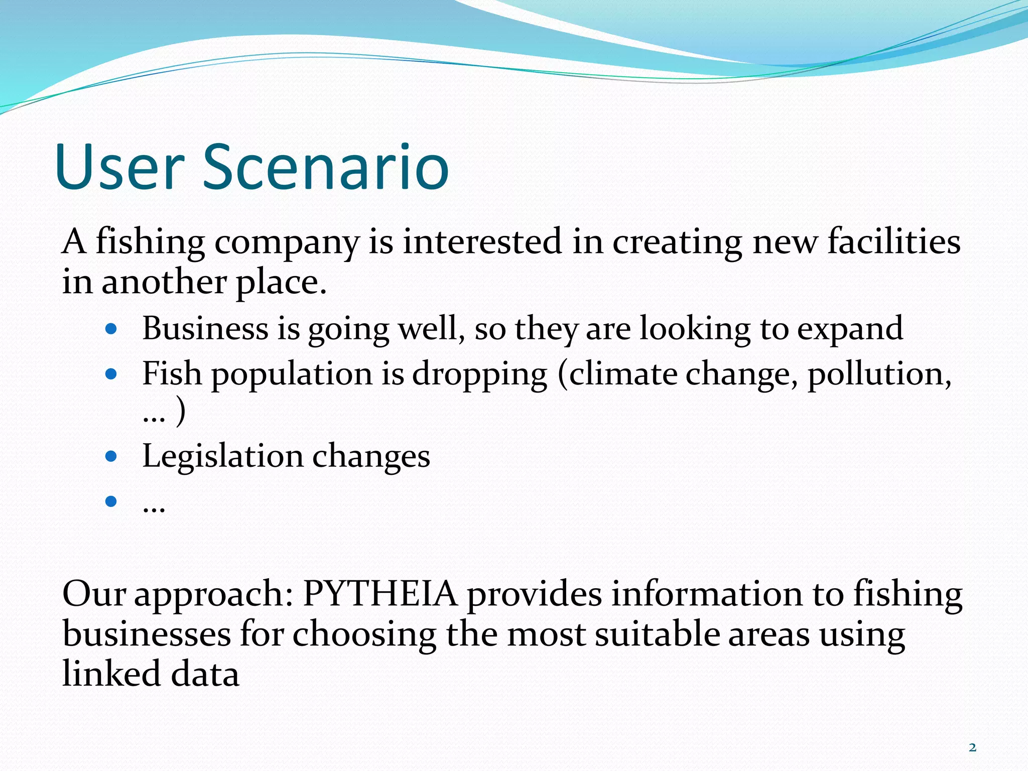 This document describes a project to create a visualization of current fish population and fishing legislation around the world. The project, called PYTHEIA, will provide information to fishing businesses to help them choose suitable new locations by linking data on fish populations, laws, and management from various sources. It outlines the user scenario, workflow, ontology developed to represent the data, and plans for the user interface and enhancing the system in the future.